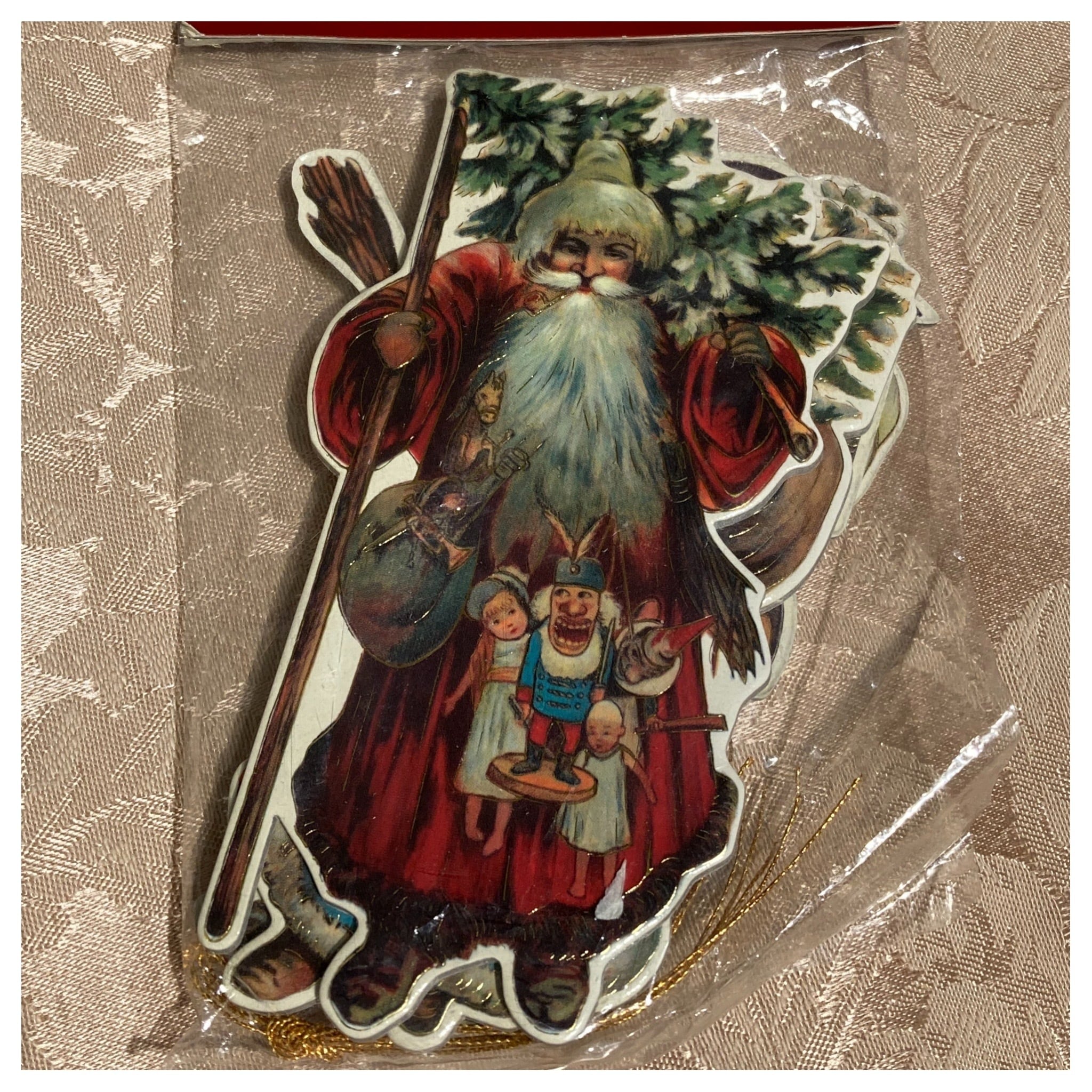 アメリカ、B.シャックマン社製品。1995年のヴィンテージのペーパーオーナメントです。アンティークのサンタクロース柄です。裏表同柄です。4枚セット。別柄です。ゴールドの吊り下げコードが付いています。未開封です。